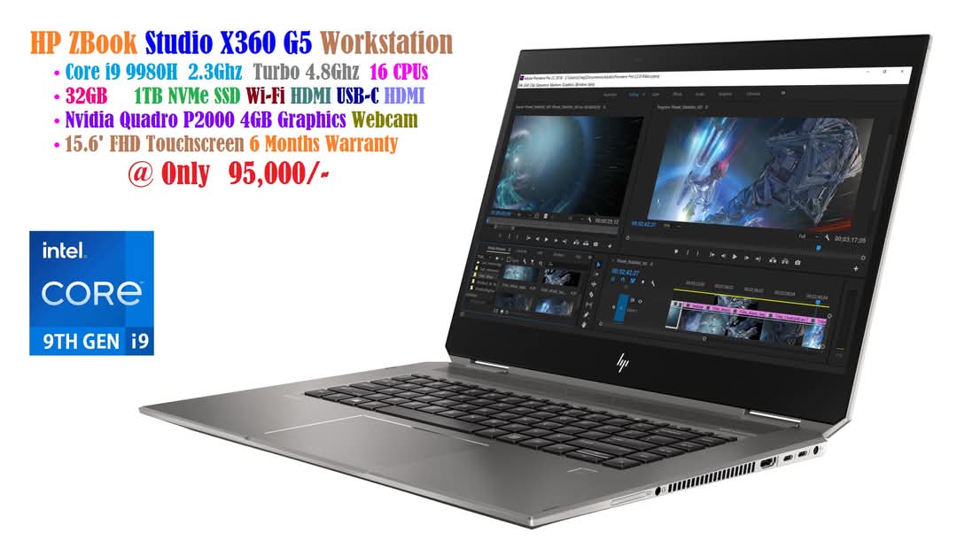 HP ZBook Studio X360 G5 Workstation Laptop Core i9 9980H 2.3Ghz 16 CPUs 32GB 512GB NVMe SSD 15.6′ FHD Touchscreen Nvidia Quadro P2000 4GB Graphics
