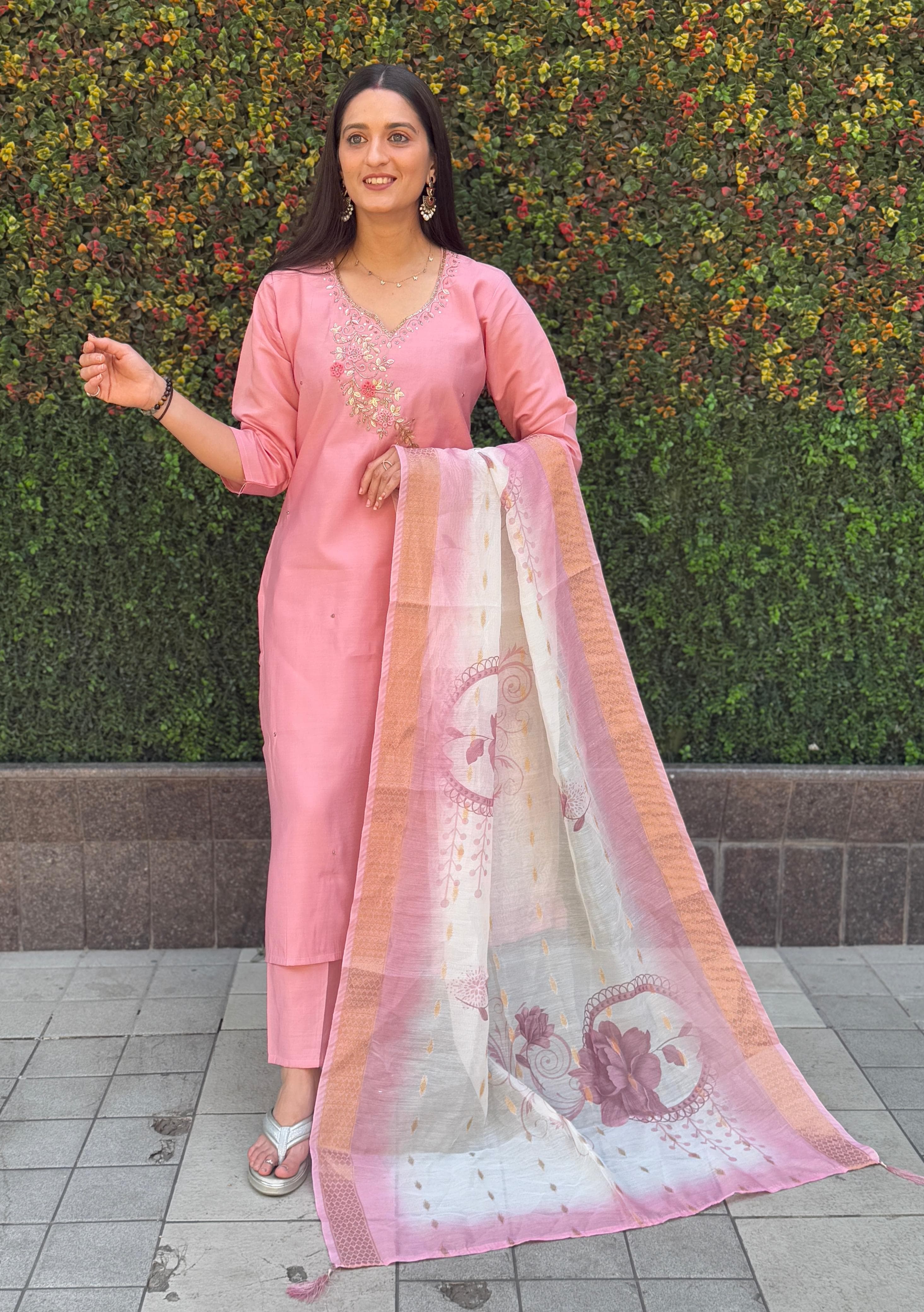 Yugal Loom Premium Roman Silk Kurti Pant Dupatta Set – Light Pink | Hand Work | Chanderi Dupatta